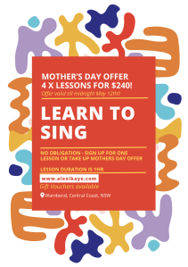 Join me in my Wamberal home studio for a one on one singing lesson. Buy one lesson voucher for a loved one or for yourself this Mother’s Day or take advantage of the special Mother’s Day Offer of $240 for 4 lessons! The cost of 4 lessons would usually be $280, so there is a nice saving on this bundle. Valid til midnight 12th May.