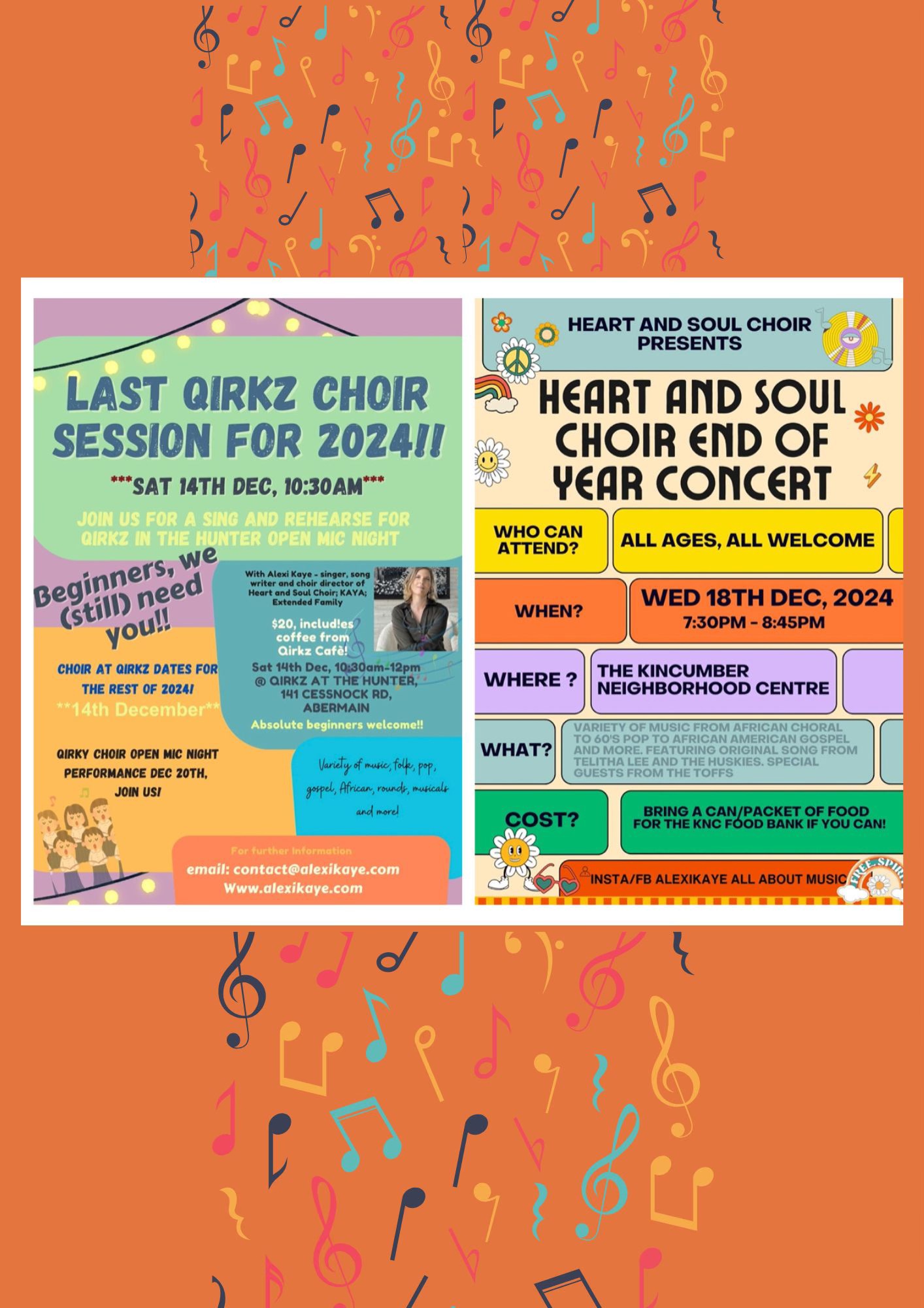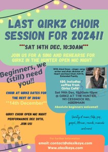 Details again: Qirky Choir, Sat 14th DEC, 10:30 -12pm, 141 Cessnock Rd, Abermain Qirkz in the Hunter. $20 includes Coffee from Cafe (If cost is an issue let me know and we can find a solution that suits you!).