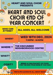 FREE end of year concert – that is, completely FREE on the 18th of Dec, at the Kincumber Neighborhood Centre, @ 7:30pm. That’s Wednesday DEC 18th at 7:30pm! Everyone is welcome folks! All ages! Why not bring your kids/grankids/parents to share this beautiful feeling of community and music making!!? If you can only attend for half or for a quarter of it that is fine with us, just come along for as long as you can. Please join us to help make this an special night. Your presence will be a gift enough but we are also asking people if you have some spare packaged food at home to bring and leave at the Kincumber Neighbourhood Centre if you’d like to contribute to their food bank for this Christmas period and beyond. Every packet counts!!